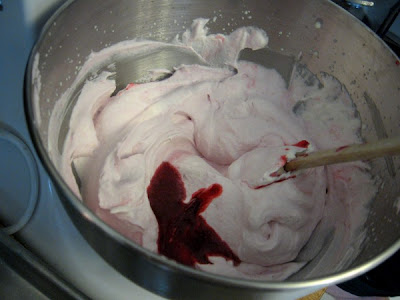 7. Fold the raspberry juice/sugar/almond extract mixture into the whipped cream. I did this in small amounts too, but I think that would be unnecessary if you don't double the recipe. How long you spend folding it will affect how uniform the color is, but probably not the taste--I tried to keep some slightly darker pink areas and a few white streaks, but once I frosted things with it everything sort of blended together.