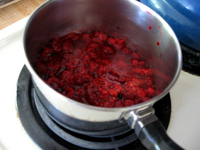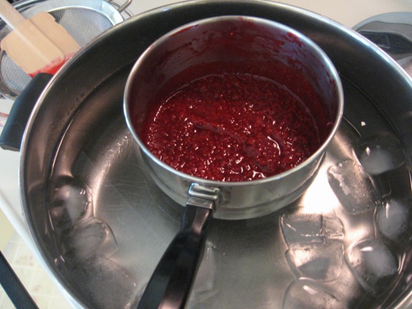 3. Now the cooked raspberries have to cool, so if you're in a hurry, put the pan in an icewater bath--just make sure none of the water gets into the raspberries. The icewater will cool them in about 15 minutes.