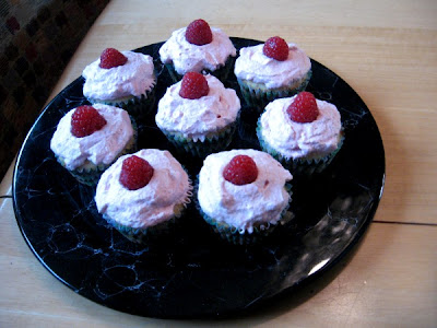 I thought. And I thought some more. At first I was thinking, flowers? Lavender? But that didn't work; I wanted something fruity and summery and refreshing, and after almost a whole month of thinking, I finally figured it out: everyone likes raspberry lemonade in the summer, right? So if I could somehow capture that in ice-cream-cupcake-form, it would be delicious! I went about looking for recipes, but wasn't too pleased with any until Patricia of Technicolor Kitchen posted a recipe for Sour Lime Cakes, and I thought, well, how hard can it be to adapt that to lemon? (After thinking about this for a little while and getting excited, I read in her post that she actually adapted a lemon recipe to make the lime one, which made my idea seem even better, if slightly less original.) I then started searching my usual recipe haunts--Recipezaar in particular--for a delicious-looking raspberry frosting. When Recipezaar didn't come up with anything that seemed right for my vision, I went back to the Cupcake Project, but while there were lots of raspberry-related posts, nothing seemed to be frosting. I then returned to Technicolor Kitchen and was very glad I did, because back in November (before I started blogging and reading other blogs) she'd posted a cupcake with Raspberry Cream, which looked like the perfect consistency for my plan.