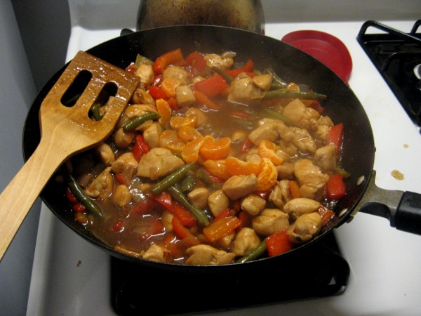 I chopped up the vegetables while Mike chopped up the chicken and got it cooking. There were so many vegetables we had to use two huge frying pans, but that means it's HEALTHY! Yay! We mixed up the sauce in another bowl with some lime juice and soy sauce. I like to think it added to the flavor, but I didn't taste it without them, so I don't know--I just know it tasted good! When everything was almost done cooking I noticed we had a few mandarin oranges left. And I don't mean the canned ones in juice. I mean legit you-have-to-peel-this mandarin oranges. We saw them in the store and bought them once and haven't found them again (or if we see something that claims to be mandarin oranges, they usually look much bigger than what we got that time so we assume they're mislabeled clementines).