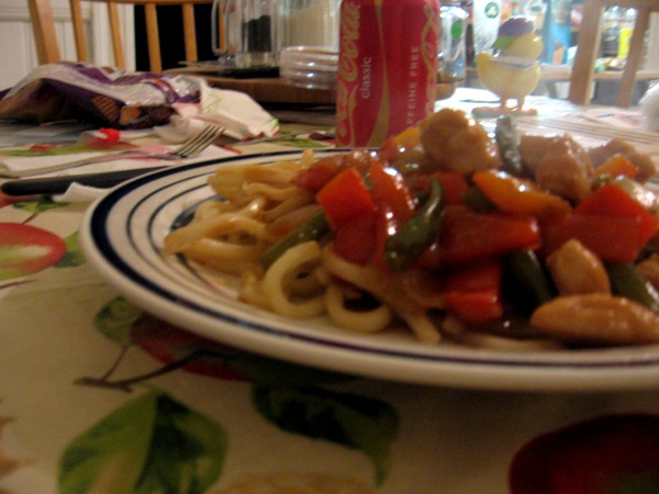 orange ginger sauce/glaze, some chicken, three(?) red peppers, two onions, and a pound of green beans. By random luck, we found udon noodles in the grocery store--I learned to love Udon from Fire and Ice, so it seemed appropriate. And, honestly? I'm not sure I can write a recipe for a stir-fry, because I'm not sure I want other people following the recipe exactly--the whole point is to play around with it and add things that you think would be great.